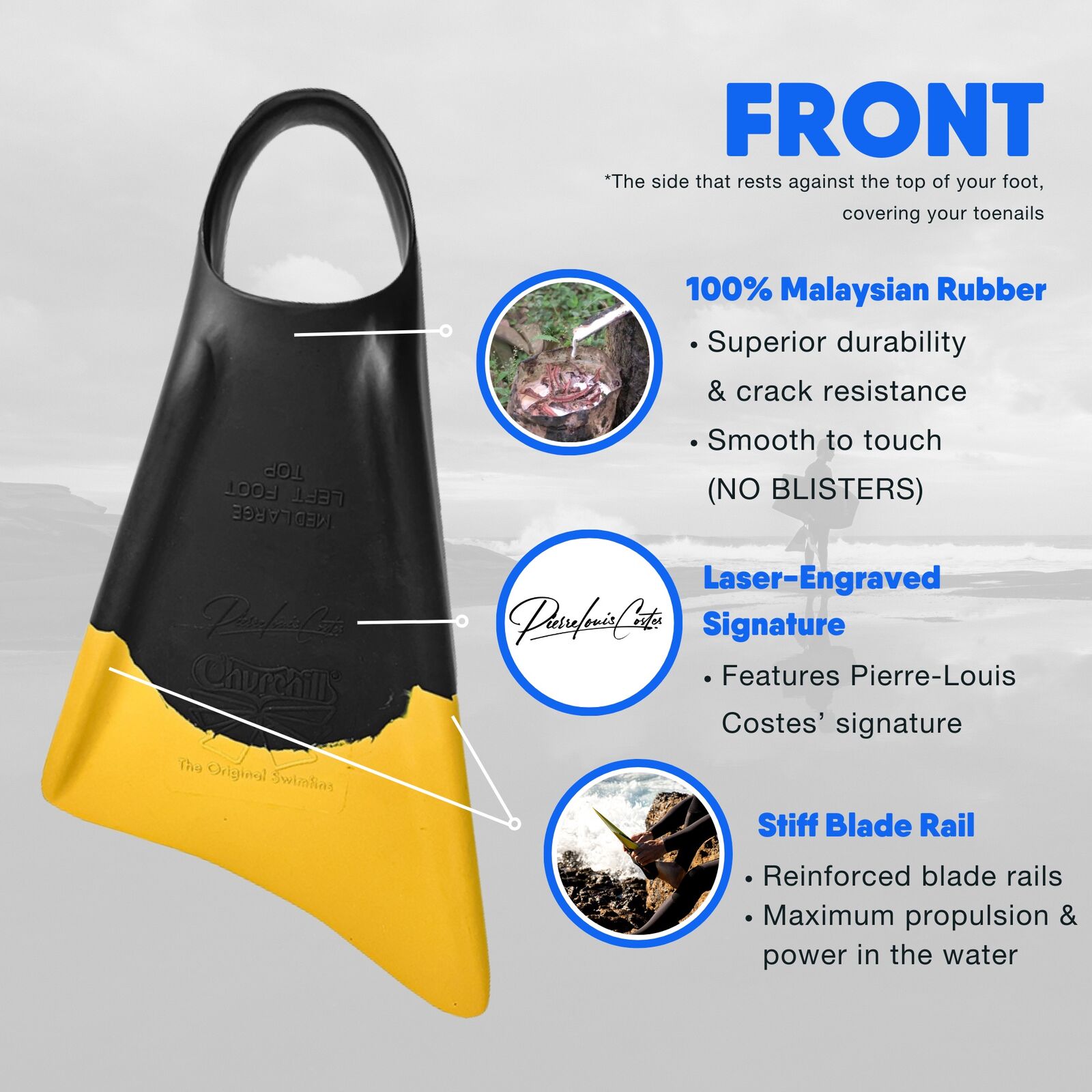 Introducing the Pierre Louis Costes Signature Makapuu® Swim Fins, developed in collaboration with the 2x world champion bodyboarder. After refining the stiffness to Pierre’s liking and incorporating Pierre's feedback, we proudly present these fins made with 100% Malaysian rubber. Each pair features Pierre's signature laser-engraved on the top and is color-matched to his Morey signature pro board, ensuring a cohesive and stylish look. These fins offer exceptional performance and a personalized touch for the dedicated world champion bodyboarder.