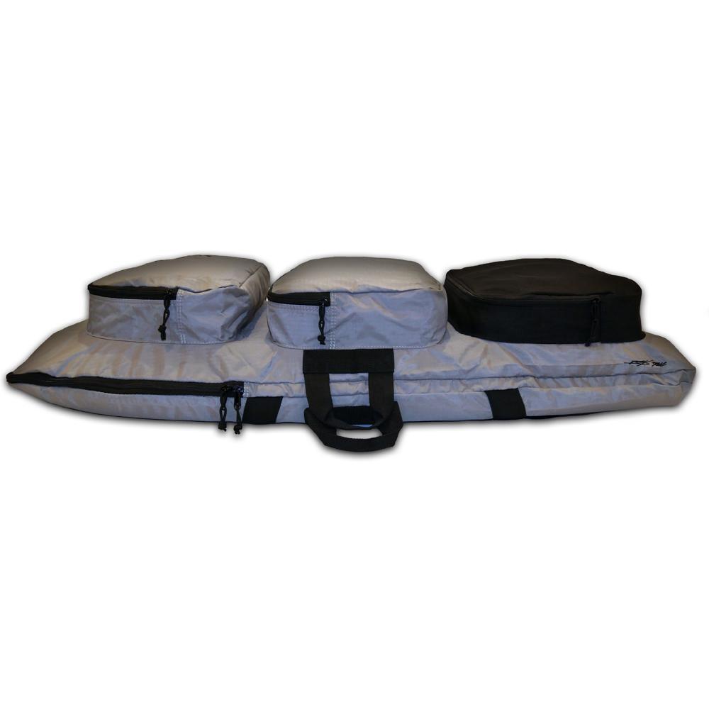 Designed by Mike Stewart, The GYROLL Ultra-Light Day Tripper Boardbag is a day use board bag capable of carrying up to two 42″ boards "snugly". It’s unique design allows the bag to be easily compressed into a small inner pocket for compact storage while travelling or at home. The Ultra Light Bag has 2 dry pockets and 1 mesh pocket for wet stuff.
