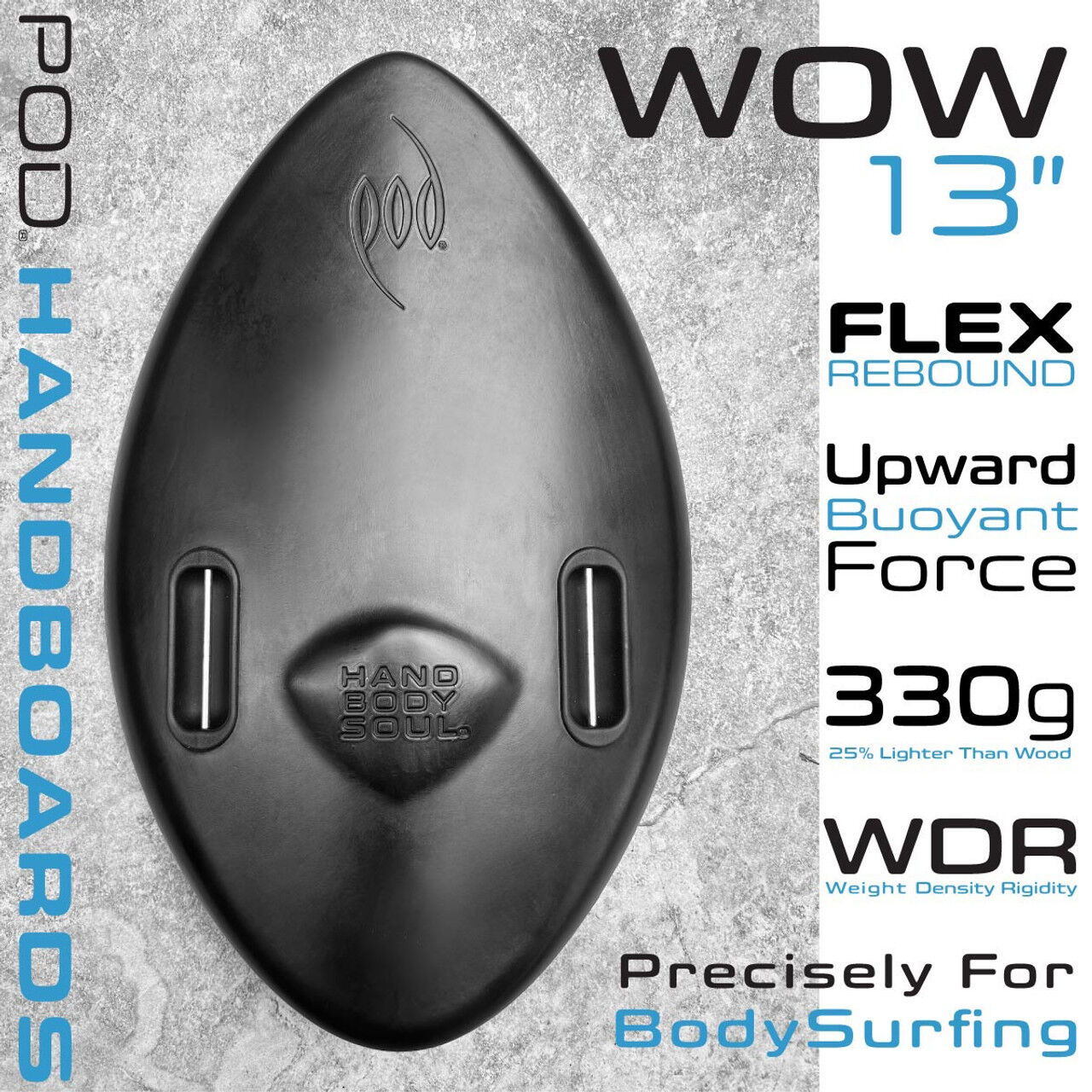 Comfort and control are paramount. The WOW 13" features POD's revolutionary ergonomic palm hold, the world's first true palm support deck, designed to mirror the natural curvature of the human hand. Unlike flat-deck handboards that cause strain and fatigue, POD's convex top surface provides a relaxed, natural grip and superior stability.