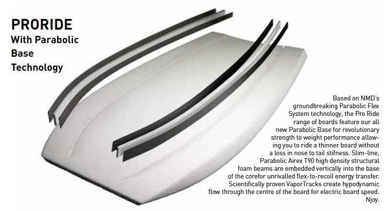 PRO RIDE: Based on NMD'S groundbreaking Parabolic Flex System technology , the Pro Ride range of boards feature the new Parabolic Base for revolutionary strength to weight performance allowing you to ride a thinner board without a loss in nose to tail stiffness. Slim line Parabolic Airex T90 high density structural beams are embedded vertically into the base of the core for unrivalled flex to recoil energy transfer. Scientifically proven vapor tracks create hydrodynamic flow through the centre of the board for electric board speed.